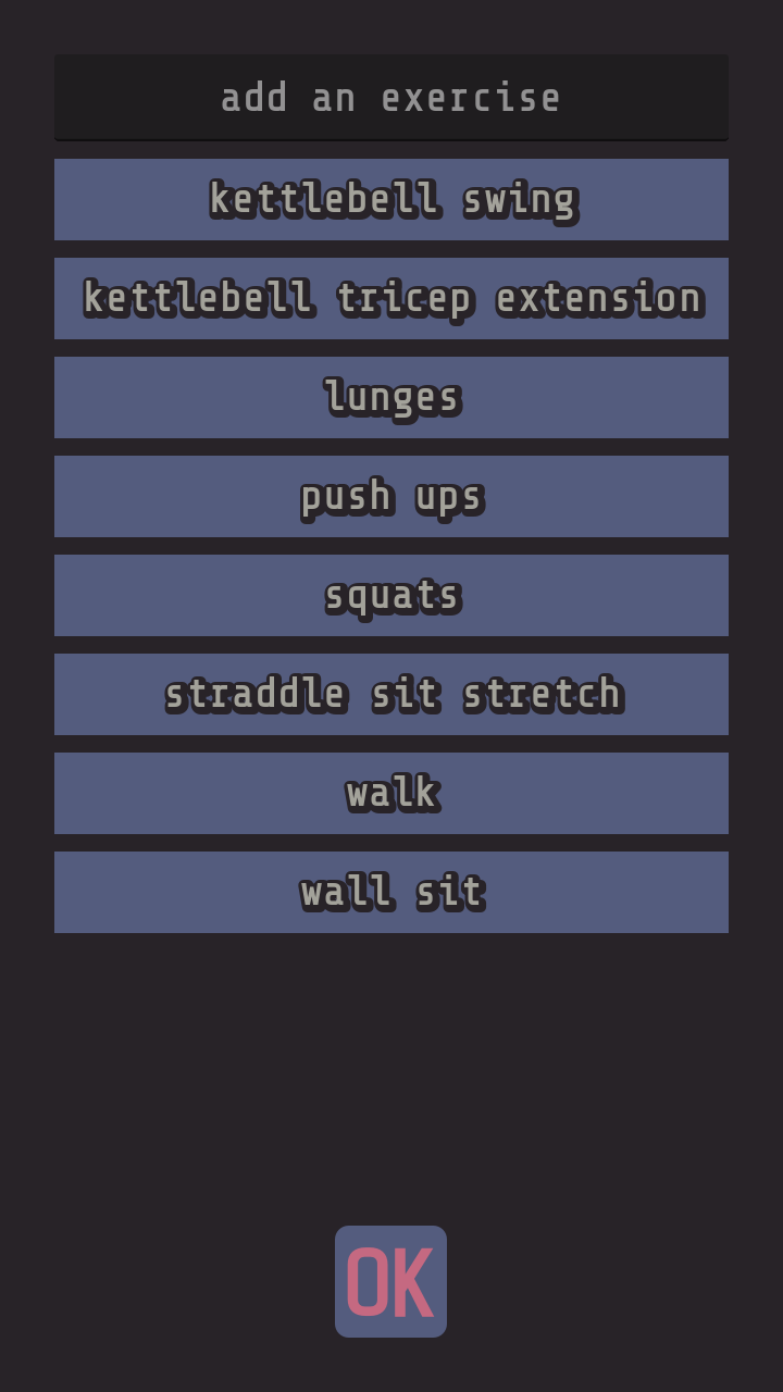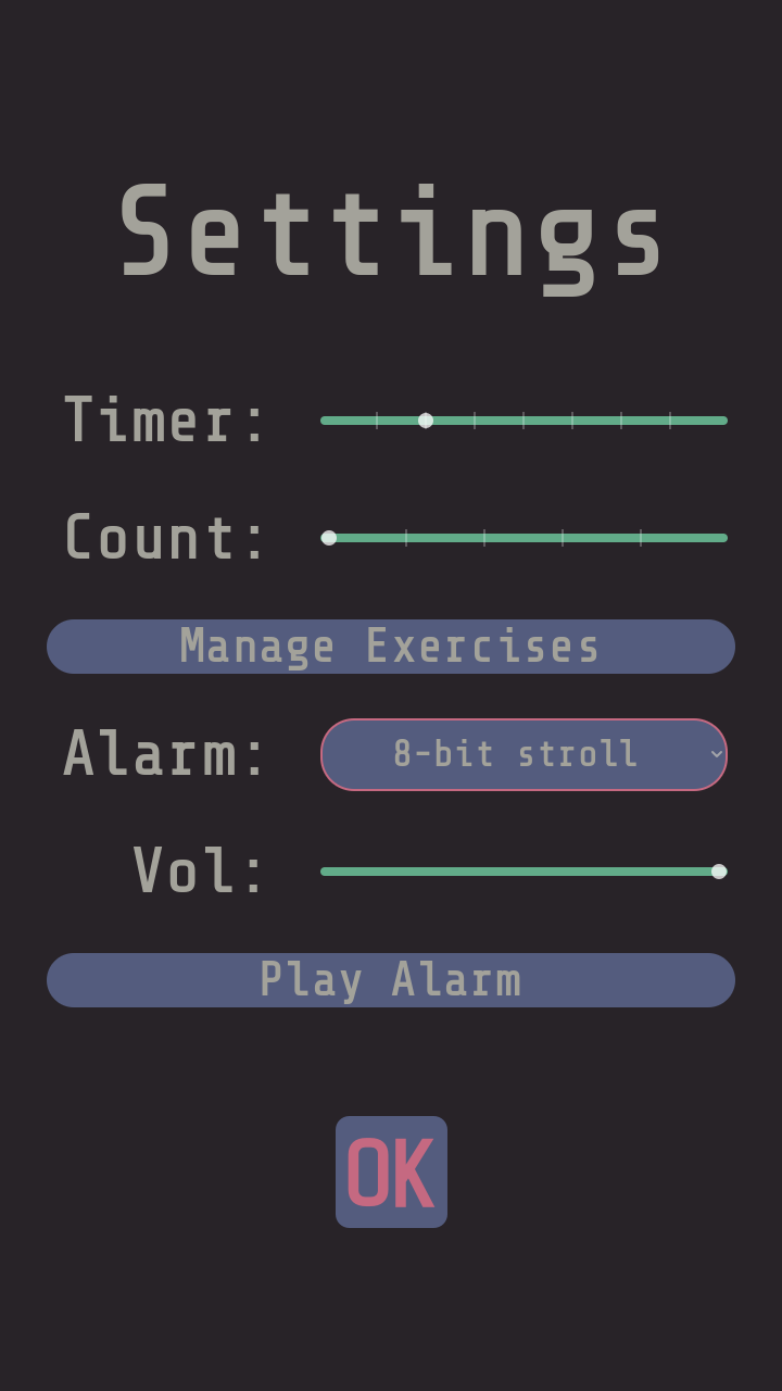 Configurable timer between 10 minutes and 4 hours in ten minute increments. When the timer expires it'll play an alarm sound and then suggest 0 - 5 exercises, depending on how many you've selected in the settings. It comes with a core list of body weight exercises / movements, but is completely configurable via the Manage Exercises screen.